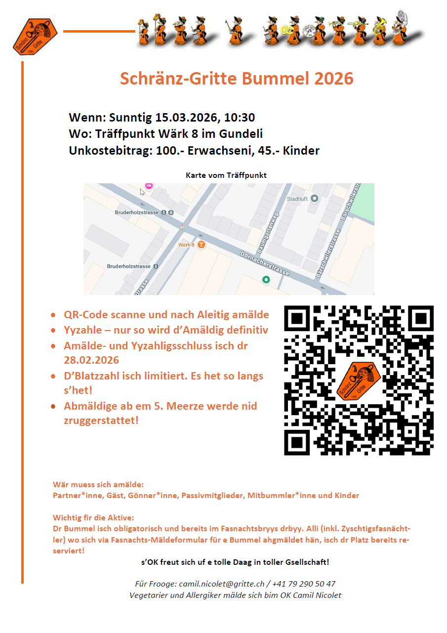 Wichtig: bitte teile uns hier die Namen aller Teilnehmer dieser Anmeldung mit. Überweise rasch möglichst den Betrag mittels Einzahlungsschein. Erst bei Zahlungseingang wird die Anmeldung definitiv. Nachdem du den orangen Button 'Anmelden' gedrückt hast, wirst du eine E-Mail erhalten (siehe auch im Spam nach).